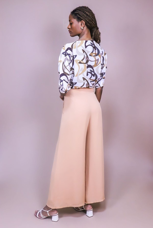 A proposta da Calça Pantalona Isa Vieira é um look mais clássico, porém sendo usada com tênis e uma camiseta se torna aero look.